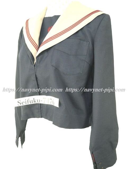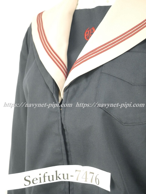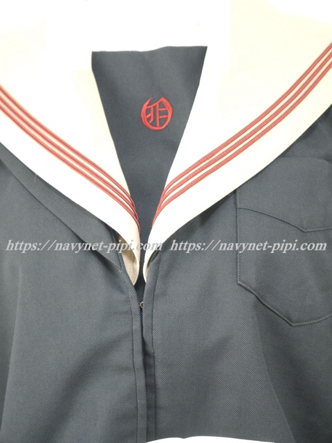 | 詳細/特徴 冬セーラー服 (上着・襟カバー付き) 濃紺のセーラー服♪ セーラー襟にエンジ色ライン3本入り☆ 胸当てに校章刺繍・前開きスナップ 胸ポケット・ネーム刺繍入り 襟カバーにエンジ色ライン3本入り♪ |