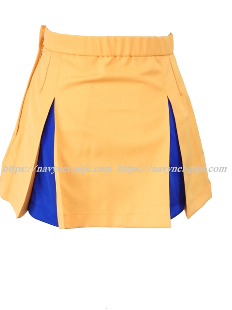 | 詳細/特徴 デザインプリーツ チアー 鮮やかなオレンジ色のスコート♪ 前後4本プリーツ内はブルー生地のアクセント 3段ホック留め・ファスナー☆ |