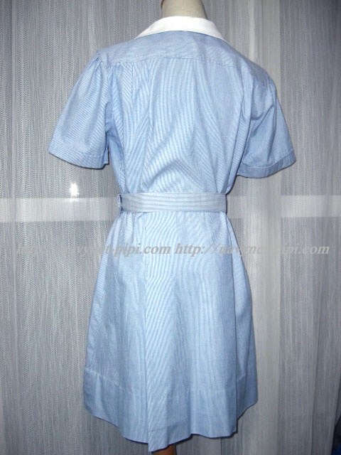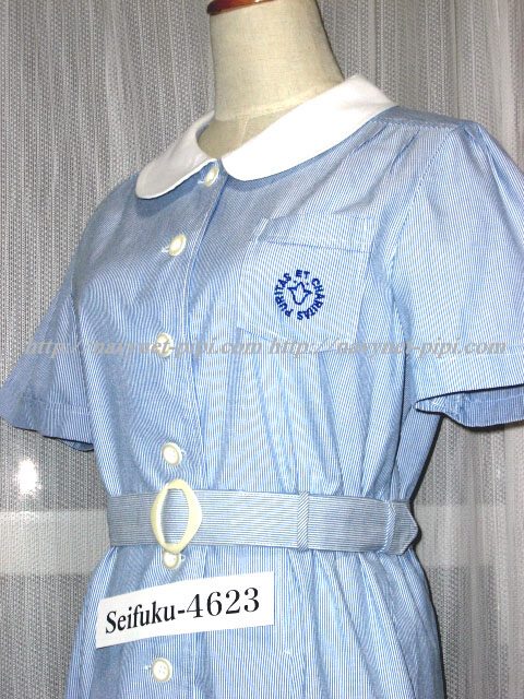 | 詳細/特徴 夏服4点セット (ワンピース・専用ベルト・指定靴下・スクール水着) ☆旧制服☆ ブルーとホワイトのストライプ柄のワンヒース☆ 左胸の校章刺繍がポイント♪ |