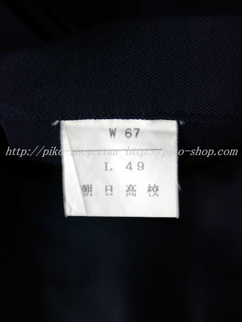 | 詳細/特徴 冬服3点セット (指定リボン付き) ☆とても人気制服☆ 【リボンは新品で白色・素材はナイロン100%のハネクトーンです】 上着は濃紺で襟に白線1本ライン・左脇下ファスナー☆ 胸当てに白で朝日高校の校章刺繍がポイント・左前にポケット付き♪ スカートも濃紺で6本ボックスプリーツスカート♪ 左ファスナー&ポケット☆ ウエスト調整は3段ホックタイプ☆ |