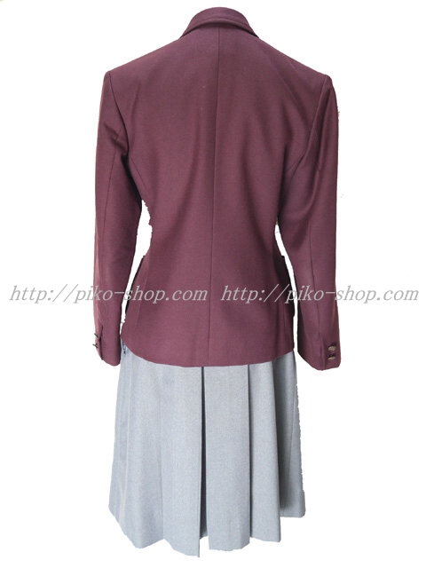 | 詳細/特徴 冬服3点セット (ブレザー・スカート・校章バッチ) ☆旧制服☆ 小豆色の珍しいブレザーとグレーのボックススカートバージョン♪ 上着は前2個ボタン・袖口にも2個ボタン☆ スカートは6本ボックスプリーツ・左ファスナー・左ポケット ウエスト調整はアジャスタータイプ☆ |