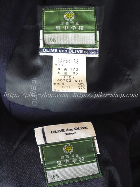 | 詳細/特徴 冬服3点セット (上着・スカート・専用スカーフ) ☆大きめサイズ☆ 【スカーフは新品で白色の帯タイプで素材はポリエステルのデシンです】 濃紺のセーラー服セット♪ 濃紺セーラー服・襟に白線3本・左脇下ファスナー☆ 人気の胸当て付き・スカーフ留め付き♪ 裏地に「OLIVE des OLIVE」のロゴ入りタイプ☆ スカートも濃紺で28本車ヒダ仕様のプリーツスカート☆ 左ファスナー&ポケット☆ ウエスト調整はアジャスタータイプ♪ 裏地は珍しいポリエステル素材のメッシュタイプです♪ スカートのファスナー金具が「OLIVE des OLIVE」のロゴ入り♪ ☆上着もスカートも内側に学校名タグ付き☆ OLIVE de OLIVEは学生服のメーカー「TOMBOW」がすっきり!かわいい! おしゃれな女の子毎日着る制服だってかわいく見せたい シルエットを綺麗にスリムに、キュートでいたいという願いを 叶える制服を目指して作った女の子の為の新しいブランド制服です(^^♪ |