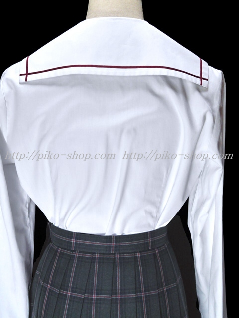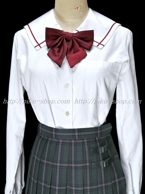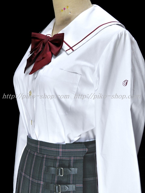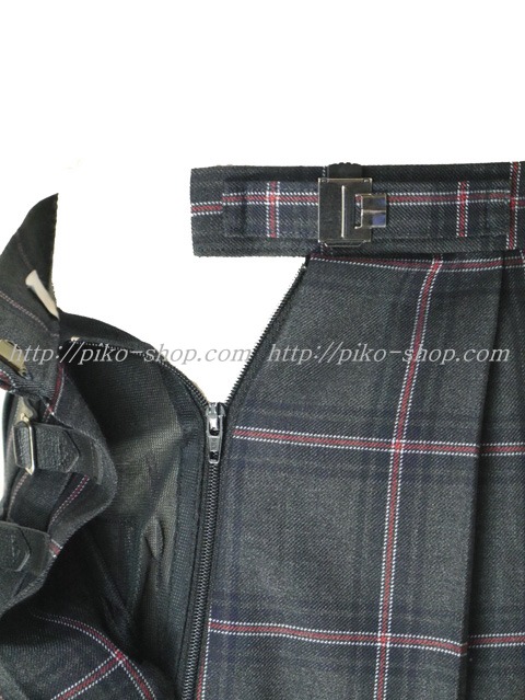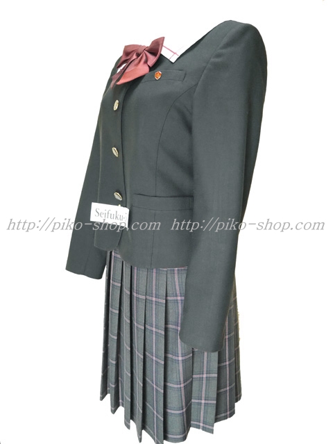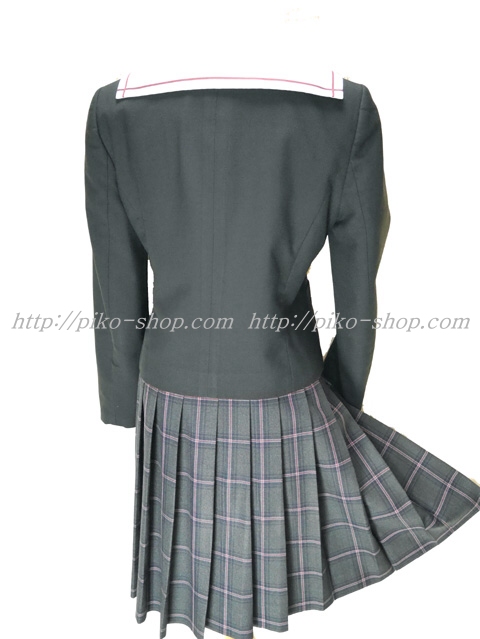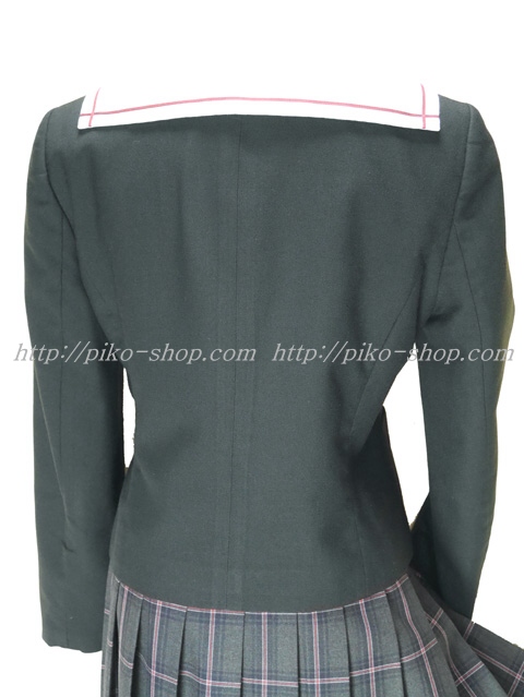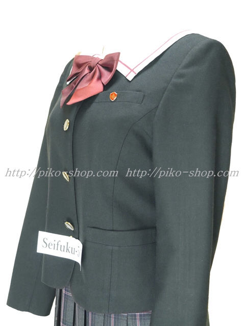 | 詳細/特徴 冬服5点セット (ブレザー・長袖ブラウス・スカート・校章バッチ・指定リボン) ☆可愛い人気制服☆ ブレザーは襟なしタイプでダークブラウン・ボタンに校章入り☆ 左胸に校章バッチ付き・内側にネーム刺繍入り♪ ブラウスはえんじ色のラインが入ったセーラー襟が特徴的♪ 左袖の腕部分に校章刺繍入り☆ スカートはチャコルグレーにえんじ色と白のライン入りのチェック柄♪ 18本車ヒダ仕様のプリーツスカート・左ポケット&ファスナー☆ 左腰部分に巻きスカート風のベルト付きなのが特徴的でポイント☆ ウエスト調整はアジャスタータイプ☆ とても可愛い制服です(^^♪ |
