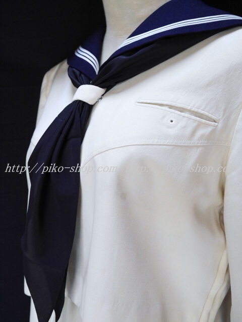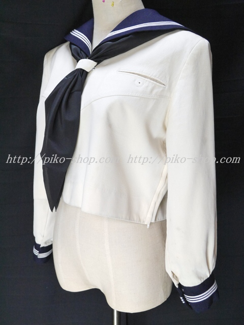 | 詳細/特徴 上着(冬服) ☆旧タイプ☆ 【スカーフは新品で黒色の三角タイプで素材はポリエステル100%のデシンです】 上着はクリーム色のセーラー服で濃紺のセーラー襟に白線3本入り☆ スカーフ留めに校章刺繍入り・左脇下ファスナー☆ 胸ポケット部分に校章エンブレム付き♪ (セーラー襟はボタン留めでお洗濯時に取り外しができます) |