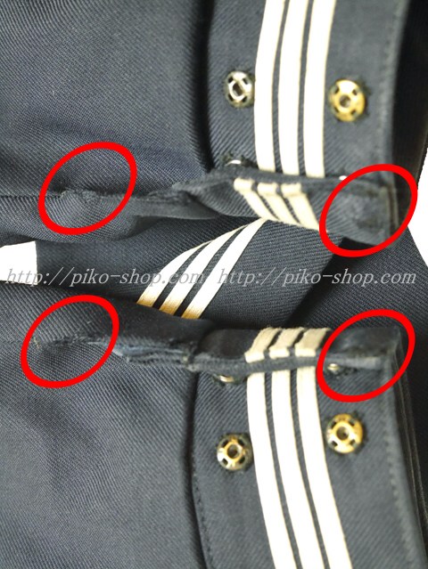 | 品質と状態 3年間の使用済み制服なので自然な使用感の傷みとお写真のような使用感の傷みがある状態です。上着は両袖口の角、両袖口周り、両袖口の上に使用感の擦れ傷みと右袖口の白線に若干ですがシミ汚れと白線ラインのほつれがある状態です。スカートは後方中央部分のウエストした30センチ辺りに7ミリ程度の生地の傷みがある状態の品質と状態です(*_*; |