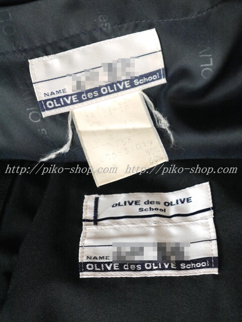 | 詳細/特徴 冬服3点セット 上着・スカート・指定スカーフ ☆OLIVE des OLIVE☆ 【スカーフはお古の三角スカーフで素材はポリエステル100%のデシンです】 濃紺のセーラー服上下セット♪ 上着は濃紺でセーラー襟、胸ポケット、両袖口に白線3本入り♪ 左脇下ファスナー・スカーフ留め付き☆ サイドファスナー金具が「OLIVE des OLIVE」のブランドロゴ♪ 裏地の全体にブランド名が施されたポリエステルの裏地☆ スカートは濃紺で24本車ヒダ仕様のプリーツスカート♪ ウエスト調整はアジャスタータイプ☆ 左ファスナー&ポケット☆ サイドファスナー金具が「OLIVE des OLIVE」のブランドロゴ♪ OLIVE de OLIVEは学生服のメーカー「TOMBOW」がすっきり!かわいい! おしゃれな女の子毎日着る制服だってかわいく見せたい シルエットを綺麗にスリムに、キュートでいたいという願いを 叶える制服を目指して作った女の子の為の新しいブランド制服です(^^♪ |