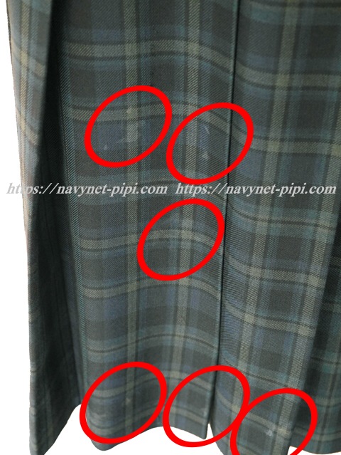 | 品質と状態 3年間の使用済み制服なので自然な使用感の傷みがあります。お写真のようにブラウスの左肩に薄いシミ汚れと右袖肩に小さな1ミリ丸程度の墨汁の飛び墨が1箇所とスカートの16本目のプリーツにお写真のようなシミ汚れと15本目のプリーツに1箇所小さなシミ汚れがあります。 |