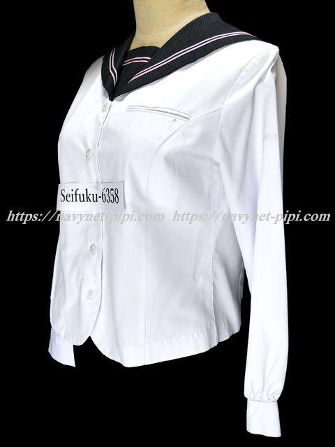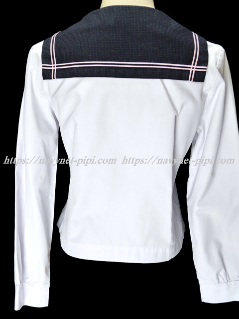 | 詳細/特徴 合服(上着) 上着は白いセーラーで前開きタイプの5個ボタン☆ セーラー襟と胸当てはグレー系のブロックチェック柄で ピンクの2本ライン入り☆ 胸に切りポケット♪ 左袖にピンクで校章刺繍入り☆ |