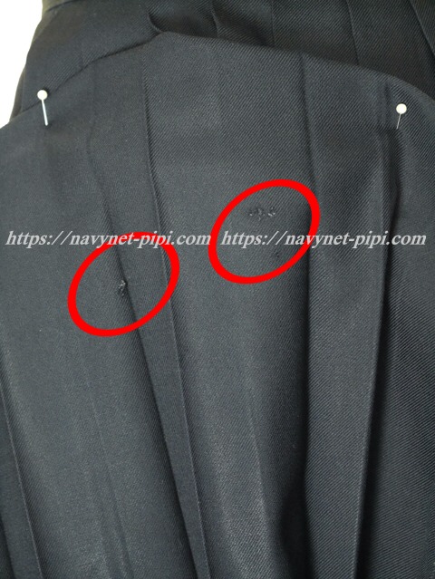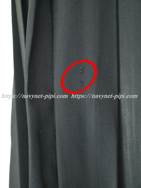 | 品質と状態 3年間の使用済み制服なので自然な使用感の傷みは若干あります♪丁寧に大切に着ていた様子なのですがお写真のような虫食い傷みが左サイド裾上28センチと右サイド裾上31センチ辺りにある状態なのと左ファスナーが壊れてスナップで代用している状態です。 |