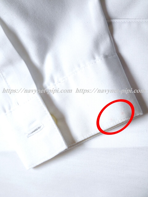 3年間の使用済み制服なので自然な使用感の傷みは若干あります♪丁寧に着ていた様子なので特に目立った傷みもシミ汚れも無い状態なのですが厳しく言っちゃうと両袖口に少し使用感の黒ずみが有るように見えます。あと左袖口にピンクペンの点シミ汚れが有ります♪