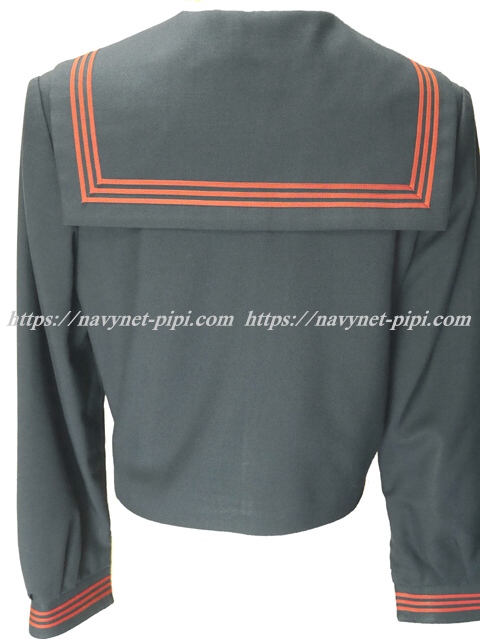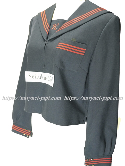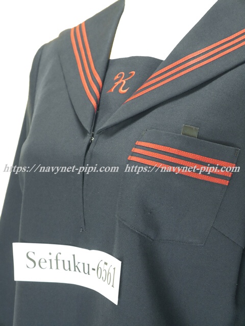 | 詳細/特徴 冬服(上着) ☆可愛いセーラー☆ 濃紺のセーラー服♪ 上着は濃紺でセーラー襟と胸ポケットと両袖口に エンジ色の3本ライン入り☆ 胸当てにエンジで「K」の刺繍入りが特徴的♪ 左脇下ファスナー☆ ☆人気の胸当て付きセーラー服☆ |