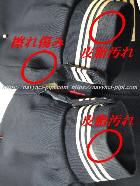 | 品質と状態 3年間の使用済み制服なので自然な使用感の傷みは若干あります♪丁寧に大切に着ていた様子で綺麗な状態なのですが両袖口に使用感の擦れ擦れ傷みがある状態なのと所々にシミ汚れと皮脂汚れが残ってしまってる品質です(*_*) |