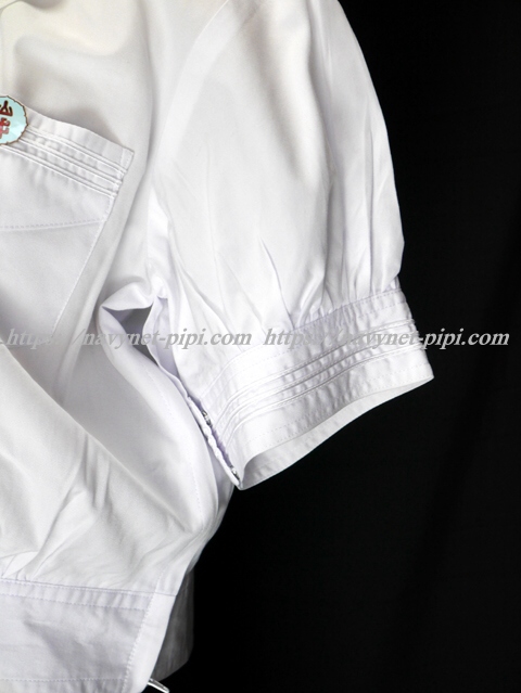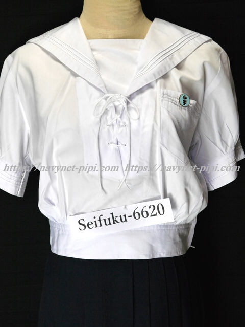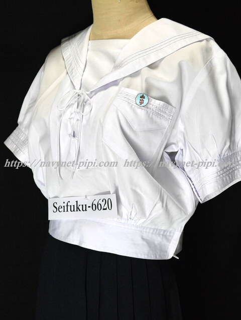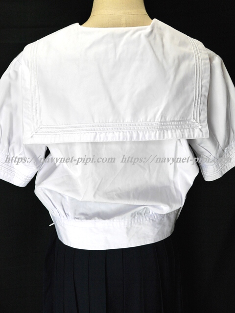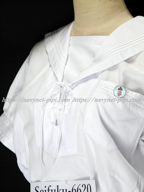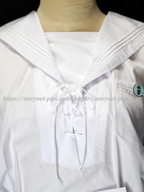 | 詳細/特徴 夏服4点セット (上着・スカート・専用紐タイ・校章バッチ付き) ☆新タイプ・貴重な校章バッチ☆ セーラー襟に白線3本・両脇下ファスナータイプ 胸当て部分が紐タイで特徴的♪ ウエスト絞りタイプの可愛いセーラー服☆ ネーム刺繍入り スカートは濃紺で28本箱ヒダプリーツスカート☆ 左ファスナー・右ポケット☆ ウエスト調整はアジャスタータイプ☆ アンダーシャツ廃止で腰スカートタイプに改良されました☆ |