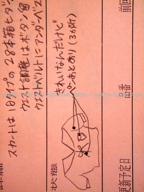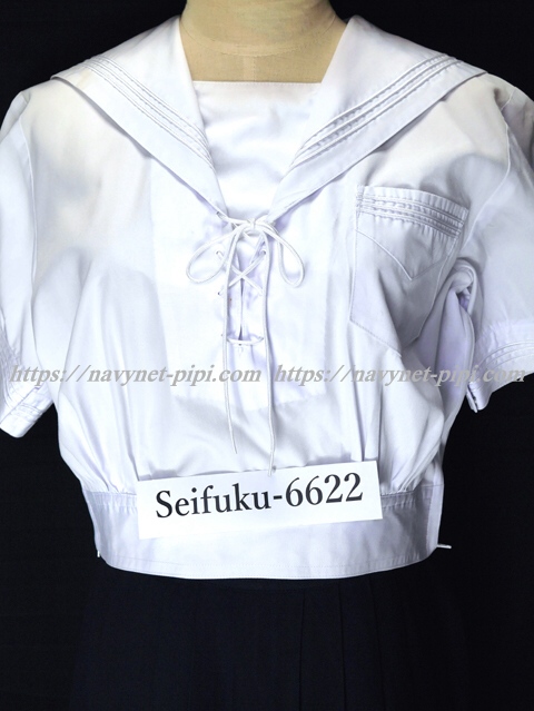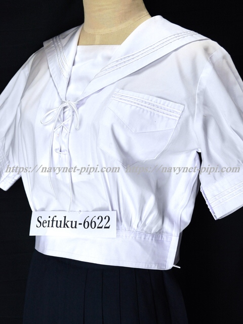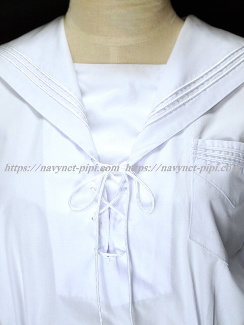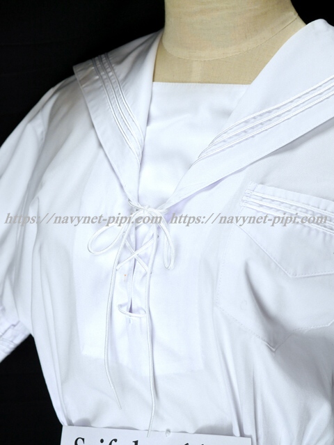 | 詳細/特徴 夏服3点セット (上着・スカート・専用紐タイ) ☆上着新タイプ・スカート旧タイプ☆ セーラー襟に白線3本・両脇下ファスナータイプ 胸当て部分が紐タイで特徴的♪ ウエスト絞りタイプの可愛いセーラー服☆ スカートは濃紺で28本箱ヒダプリーツスカート☆ 左ファスナー・右ポケット☆ ウエスト調整はボタン1個留めタイプ☆ ウエストベルトにアンダーベスト用留め穴があります♪ |