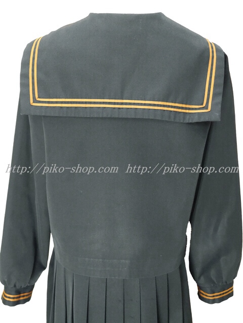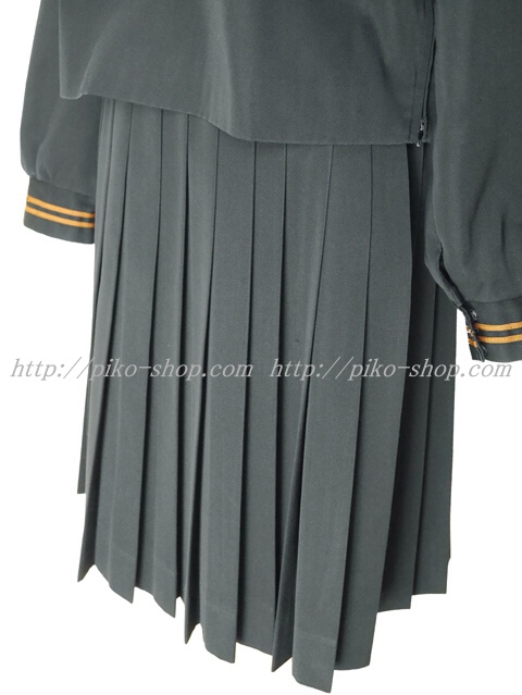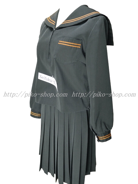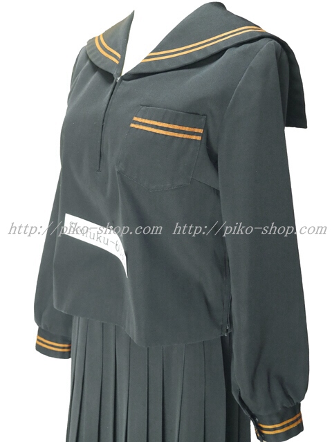 | 詳細/特徴 冬服2点セット (上着・スカート) ☆28本プリーツ☆ 珍しい黒色の少し光沢感のあるセーラー服♪ 上着はセーラー襟と胸ポケット両袖口に茶色の2本ライン☆ 左脇下ファスナー☆ スカートは28本車ヒダ仕様のプリーツスカート♪ 左ファスナー&ポケット☆ ウエスト調整はアジャスタータイプ♪ |