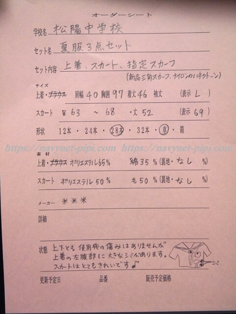 3年間の使用済み制服なので自然な使用感の傷みはあります。丁寧に大切に着ていた様子なのですが上着の左前裾辺りにシミ汚れがある状態です♪ |