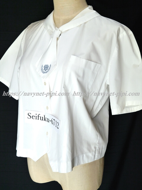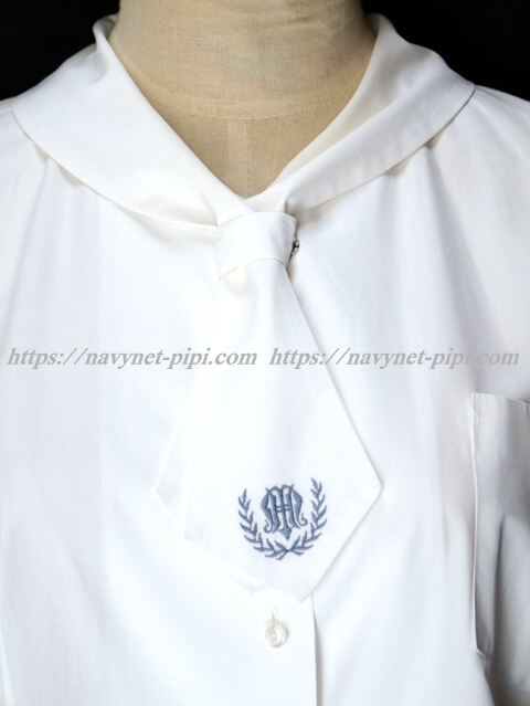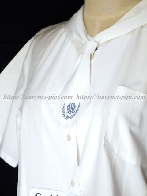 | 詳細/特徴 半袖ブラウス (指定品) ☆数箇所シミ汚れ☆ 白いブラウスで襟一体型のネクタイ付き☆ ネクタイに校章刺繍入り♪ ネクタイ留め付き・胸ポケット付き☆ |