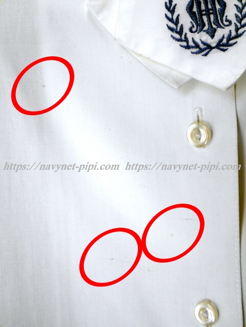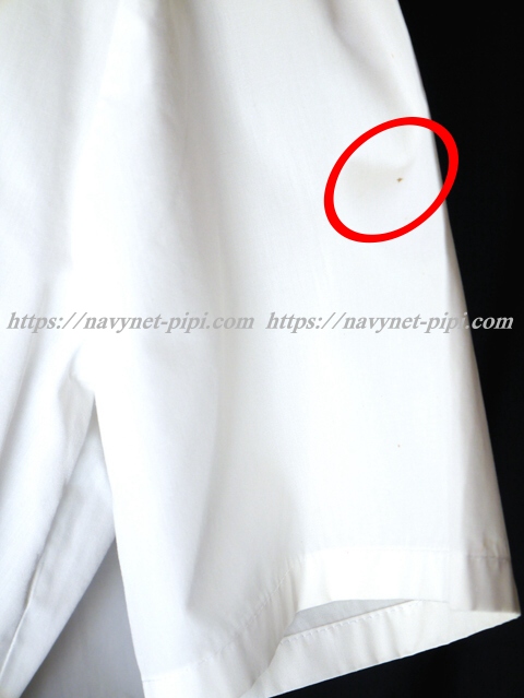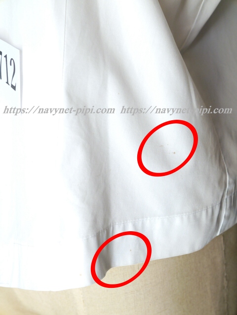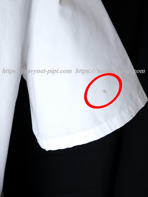| 品質と状態 3年間の使用済み制服なので自然な使用感の傷みは若干あります♪丁寧に着ていた様子ですがお写真のように右袖と左前の裾上、左袖の肩、左後ろの裾上にシミ汚れがある状態です。 |