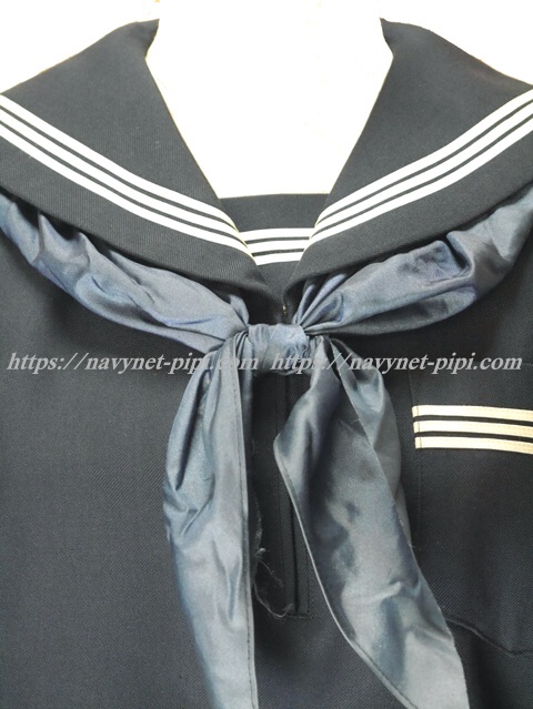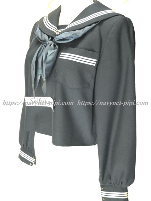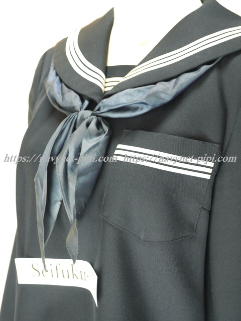 | 詳細/特徴 冬セーラー服 (上着・スカーフ付き) ☆スカーフ付き☆ 【スカーフはお古の三角スカーフで素材はナイロン100%です】 濃紺のセーラー服♪ セーラー襟と胸ポケットと両袖口と胸当て白線3本線♪ ネーム刺繍入り・左脇下ファスナー☆ |