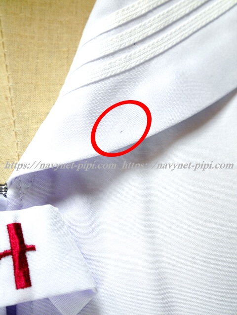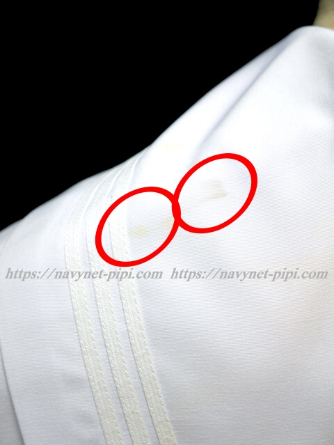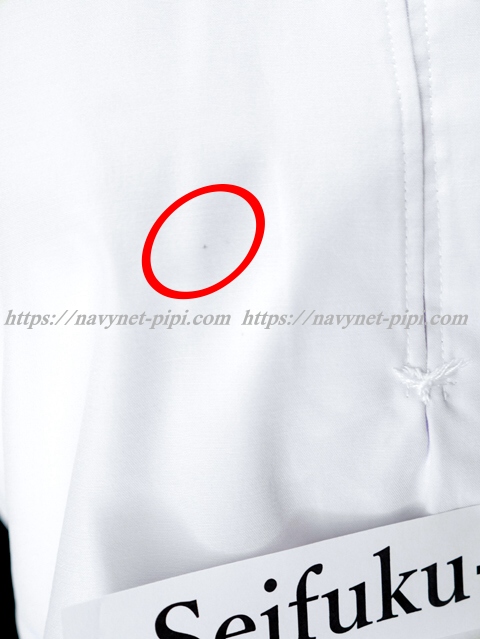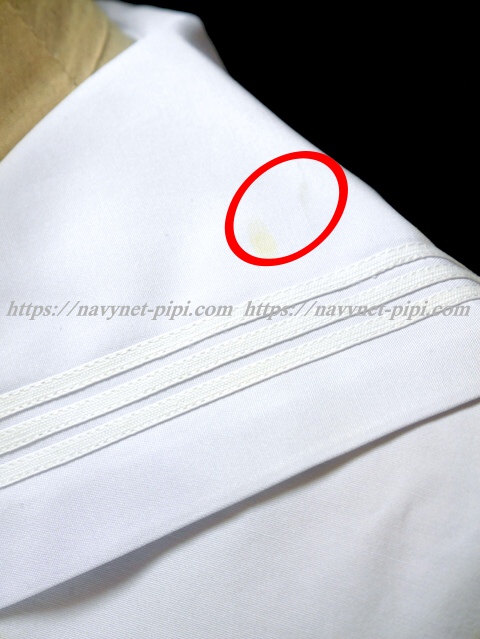 3年間の使用済み制服なので自然な使用感の傷みは若干あります。丁寧に着ていた様子ですがお写真のように左襟元と肩にシミ汚れと右胸下と前裾などにシミ汚れがある状態の品質です。