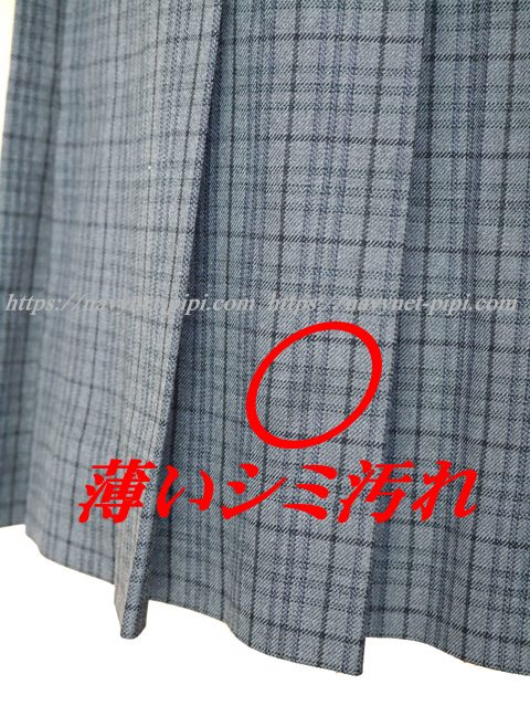 3年間の使用済み制服なので自然な使用感の傷みは若干あります☆丁寧に着ていた様子ですがお写真のように前6本目プリーツの裾に1箇所シミ汚れがある状態です☆