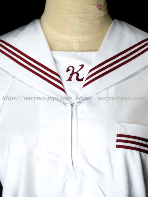| 詳細/特徴 夏服(上着) ☆大きいサイズ☆ 1箇所シミ 上着はセーラー襟にエンジの3本ライン☆ 左脇下ファスナー 胸当てにエンジ色で「K」の校章刺繍入り☆ |