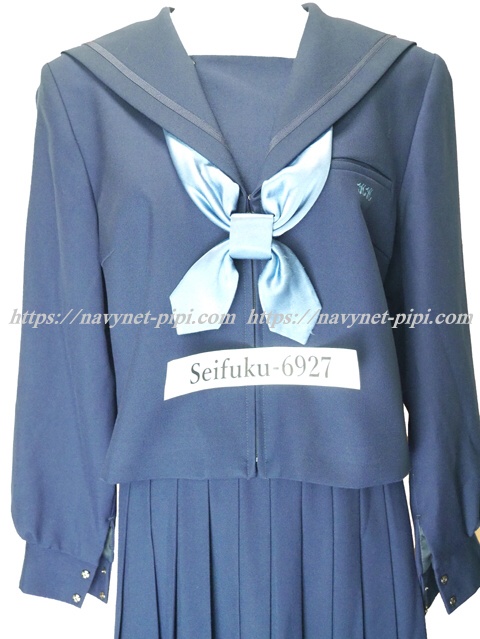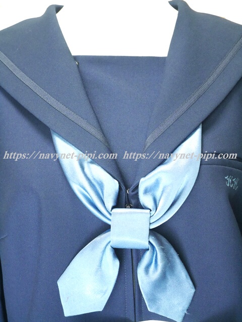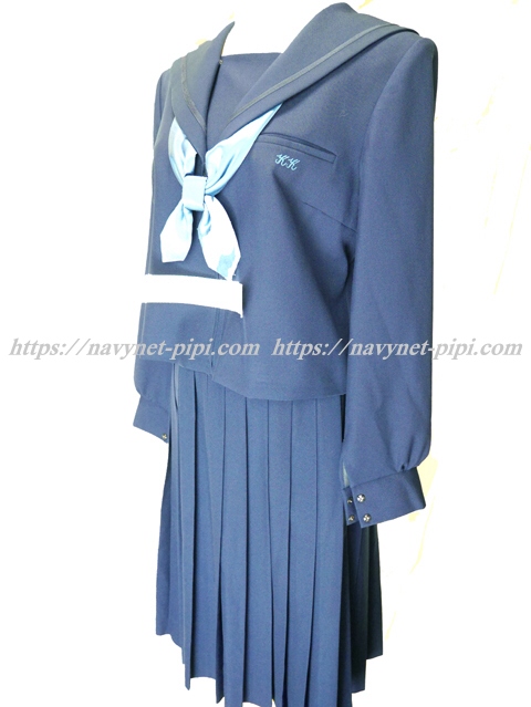 | 詳細/特徴 冬服3点セット (上着・スカート・専用シルク風リボン) ☆現行制服☆ 大きいサイズ 生地の色は青紺って感じの色です♪ セーラー襟のラインは紺色の1本太ラインです☆ 前開きファスナー・胸当て付き☆ 胸ポケットに北高校の校章の刺繍入り☆ 青紺の28本車ヒダプリーツスカート☆ 左ファスナー&ポケット☆ ウエスト調整はアジャスタータイプです♪ |