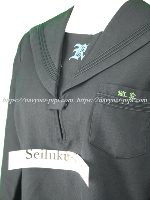 | 詳細/特徴 冬服(上着) ☆人気制服☆ ちょぴり難あり 濃紺のセーラー服♪ 紺色3本ラインのセーラー服・左脇下ファスナー☆ 胸当てに校章刺繍・胸ポケットにも校章刺繍入り スカーフ留め付き☆ ☆上着の内側に校章マーク入り☆ |