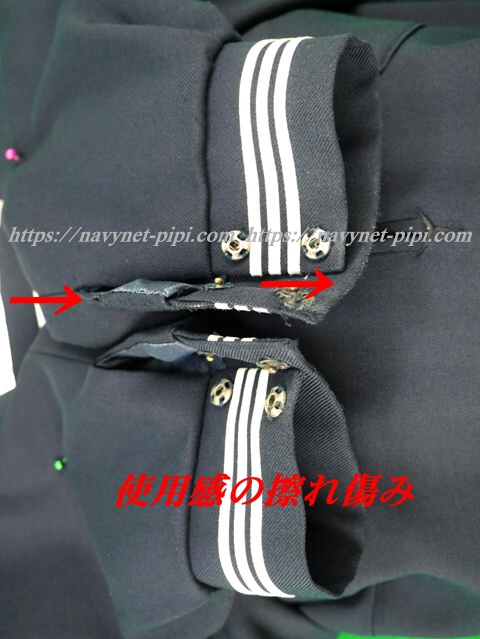 | 品質と状態 3年間の使用済み制服なので自然な使用感の傷みは若干あります。丁寧に大切に着ていた様子ですが胸元の片側ホック欠損、左袖口の白線解れの修復跡、両袖口と上部分に使用感の擦れ傷み白線の黒ずみ汚れがあります☆ |