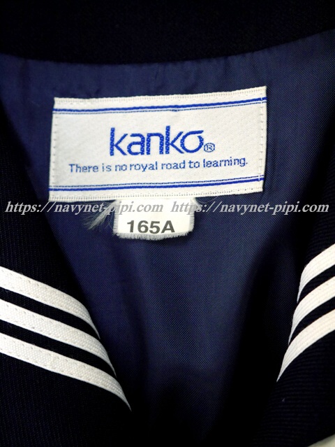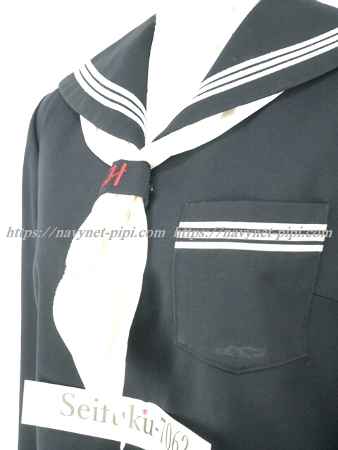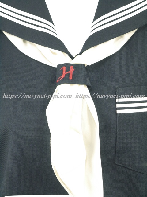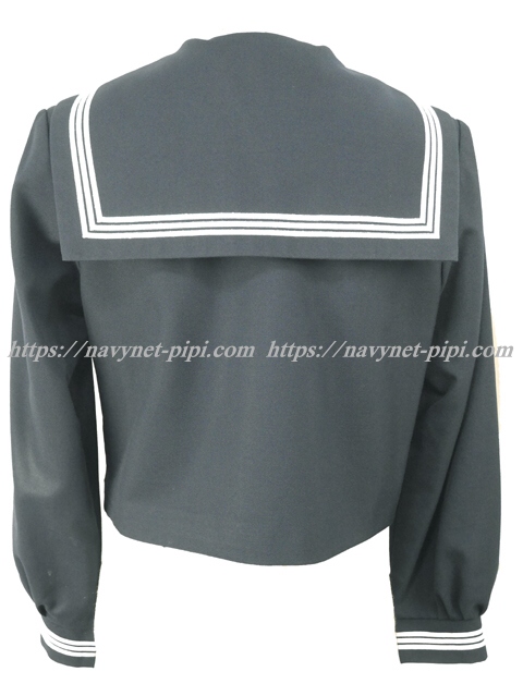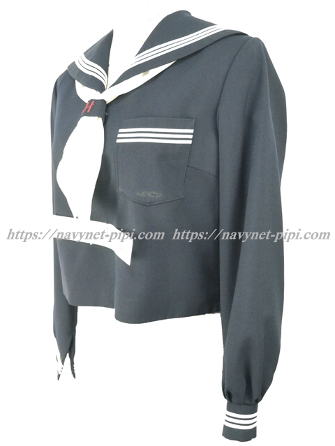 濃紺でセーラー襟と胸ポケットと両袖口に白線3本☆