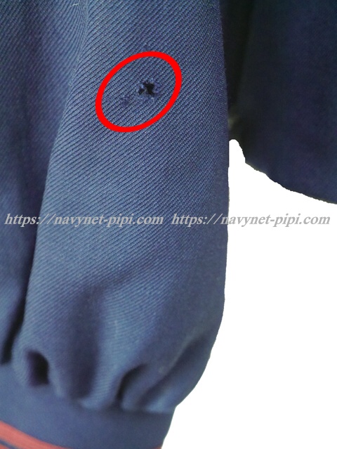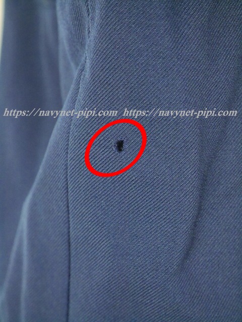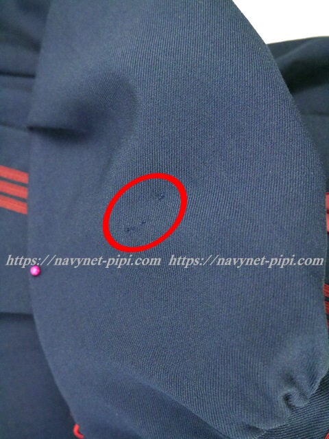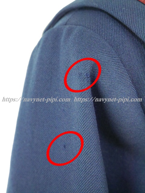 | 品質と状態 3年間の使用制服なので自然な使用感傷みは若干あります。卒業後の保管状態が悪かった様子でお写真のように背中の方横、左脇下ファスナー横、左肩、左袖、左袖口上、右袖口など虫食い傷みがある状態です。 |
