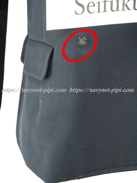 3年間の使用済み制服なので自然な使用感の傷みはあります☆お写真のように右袖にシミ汚れ、前の飾りボタン1個欠損とシミ汚れ、背中左肩に糸引き傷みがあります。 |