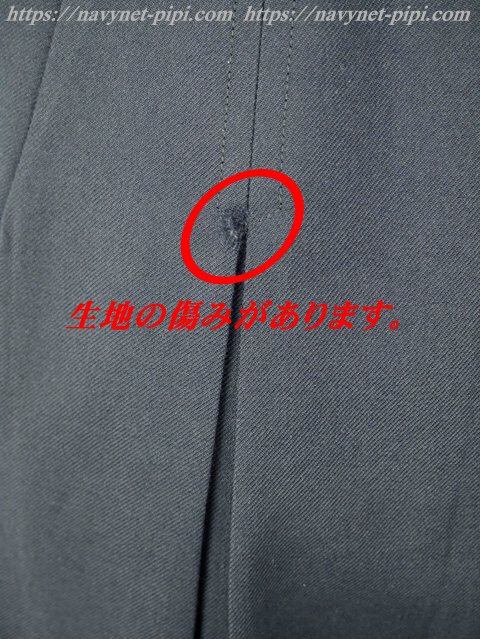 | 品質と状態 3年間の使用済み制服なので自然な使用感の傷みは若干あります。丁寧に着ていた様子で大切に保管されていた様子なので特に目立った傷みもシミ汚れも虫食い傷みも無いのですが、お写真のように後ろの左プリーツに1箇所生地の傷みがあります。 |