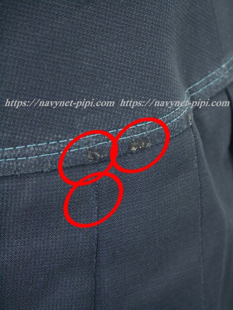 3年間の使用済み制服なので自然な使用感の傷みはあります♪丁寧に大切に着ていた様子で特に目立つ傷みもシミ汚れも無いのですが、お写真のように右腰の後ろにお写真のような生地の傷みがあります♪