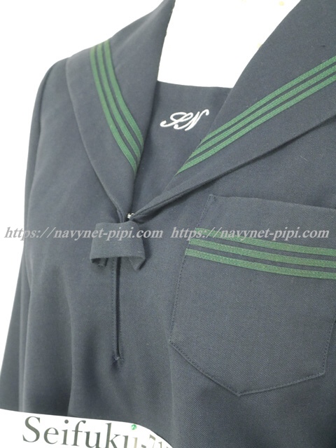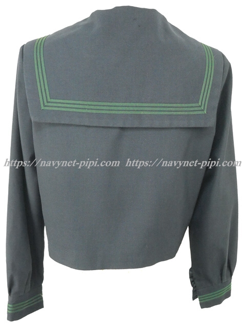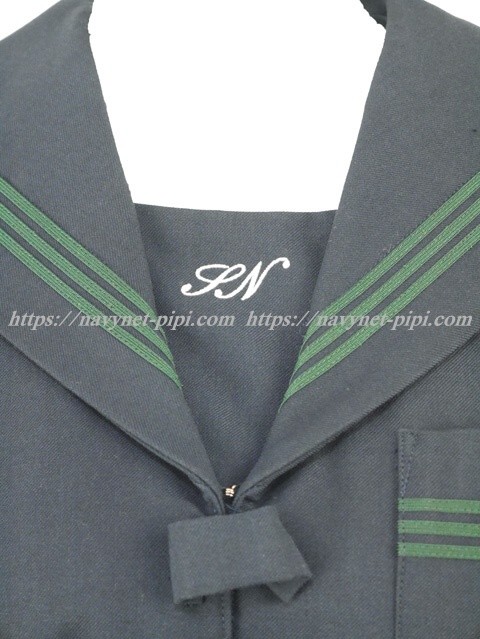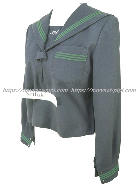 セーラー襟と胸ポケット、両袖口にグリーンの3本ライン