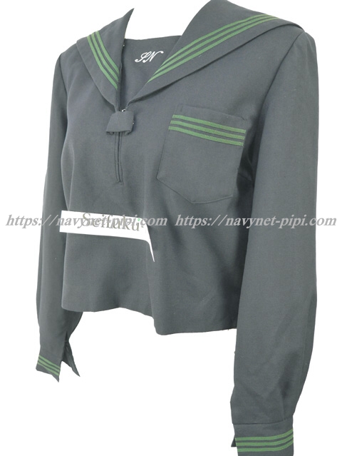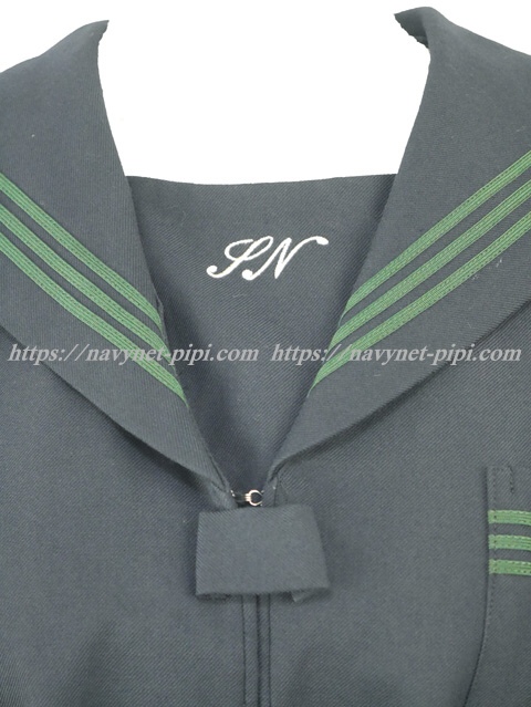 | 詳細/特徴 冬セーラー服 (上着) 飾磨西中学校 濃紺のセーラー服♪ セーラー襟と胸ポケット、両袖口にグリーンの3本ライン 胸当てに校章刺繍入り・左脇下ファスナー スカーフ留め付き |