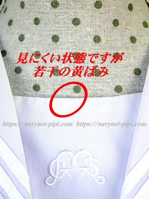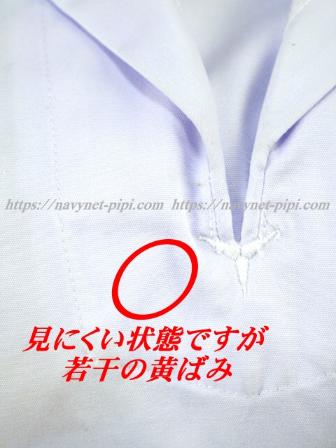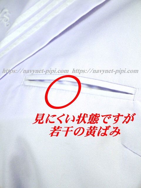 | 品質と状態 3年間使用済み制服なので自然な使用感の傷みは若干あります♪大切に着ていた様子ですが、お写真のように後ろ裾上、胸ポケット、首回り、胸下、脇下に汗染みの黄ばみがあります。 |