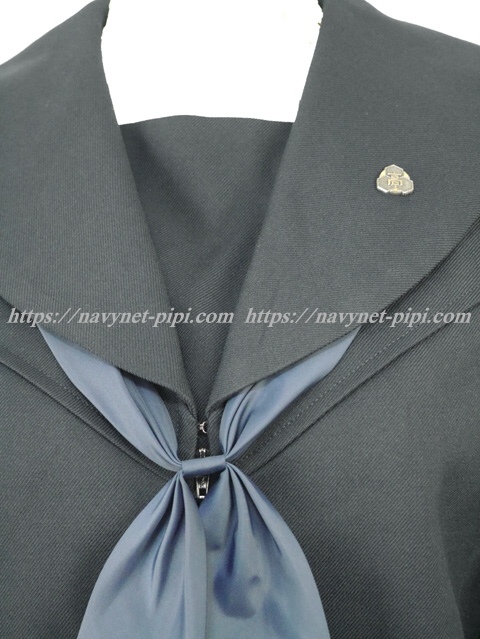 濃紺で大きな胸当て付きで左セーラー襟に校章バッチ付き♪