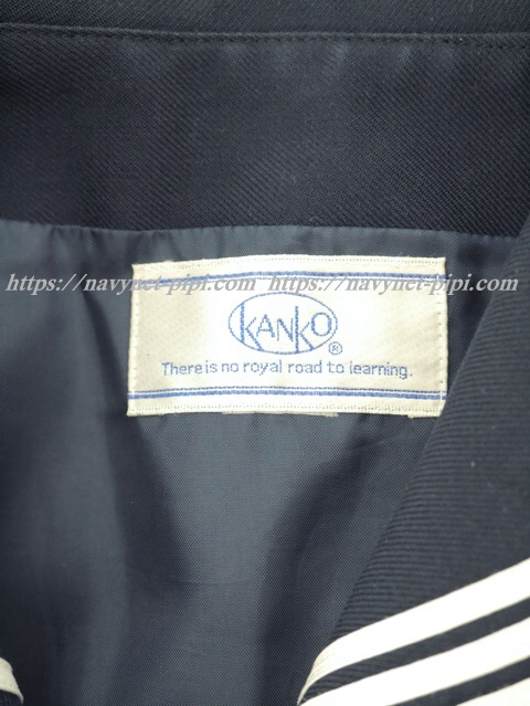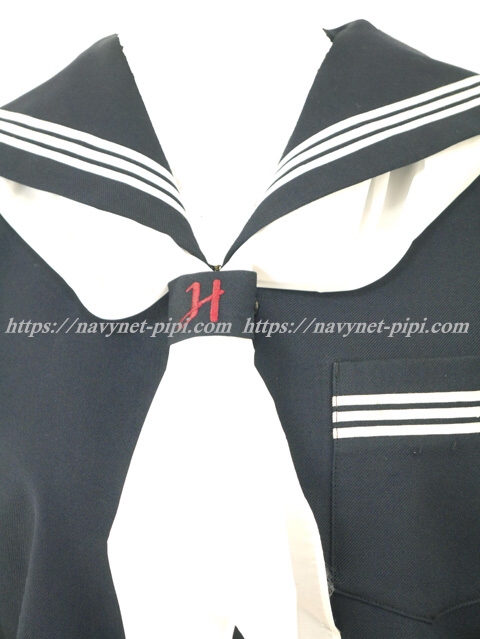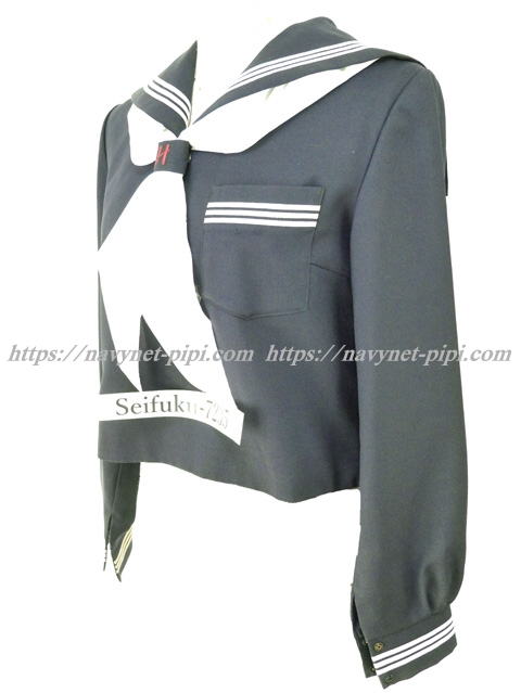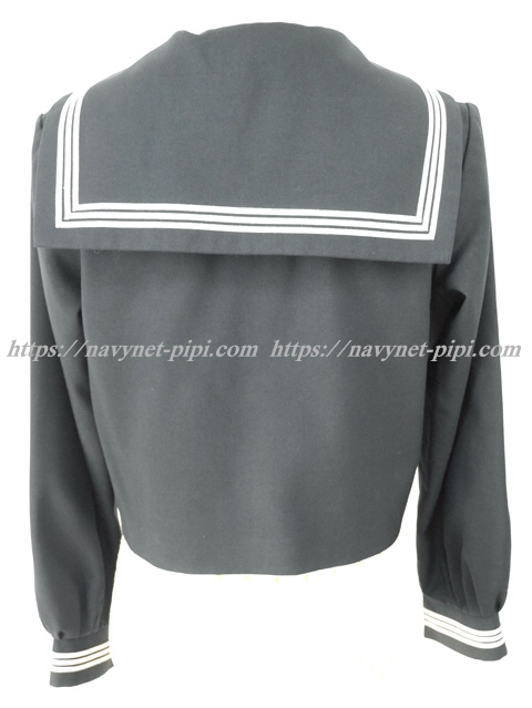 濃紺でセーラー襟と胸ポケットと両袖口に白線3本☆