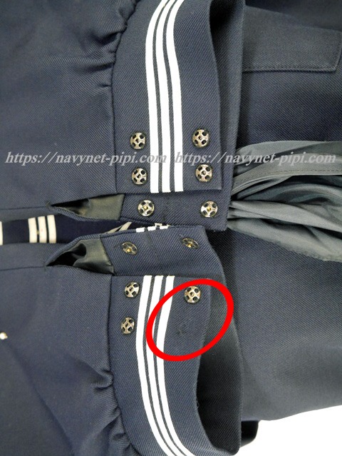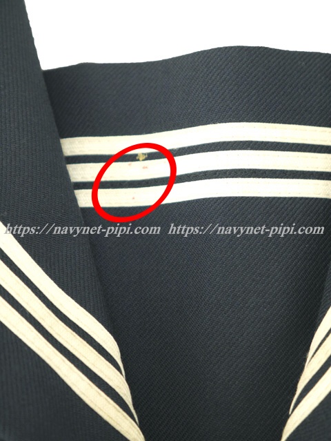 3年間の使用済み制服なので自然な使用感の傷みは若干あります♪丁寧に大切に着ていた様子なのですがお写真のように胸当ての白線にピンクの蛍光ペン?の小さなシミと右袖口の予備スナップ1個が欠損状態です☆ |