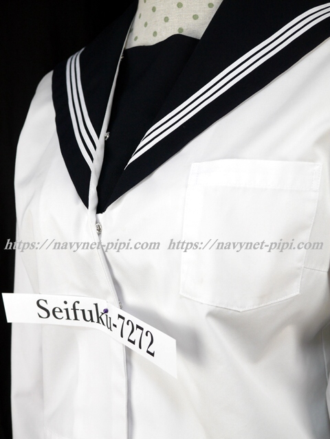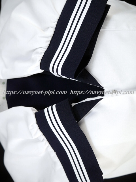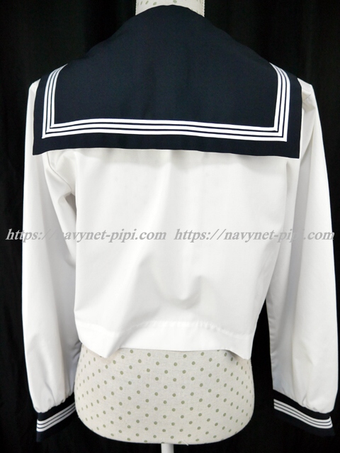 | 詳細/特徴 合服(上着・長袖) ☆広島県新庄学園☆ 白の長袖セーラー服です♪ セーラー襟と両袖口に白線3本入り☆ 胸ポケット・前開きスナップ♪ 濃紺の胸当て付き☆ |