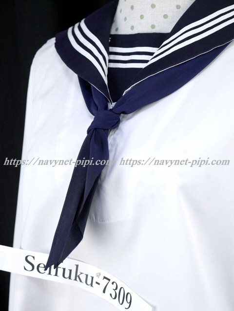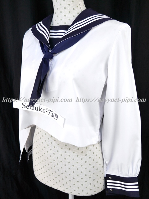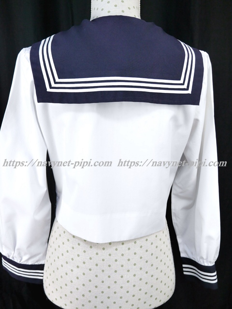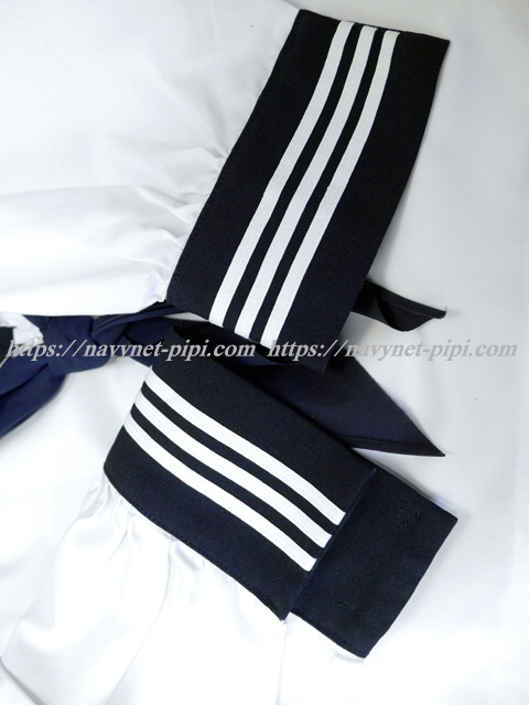セーラー襟と胸当てと袖口が紺色で白線3本入り☆