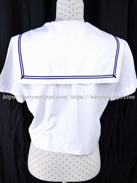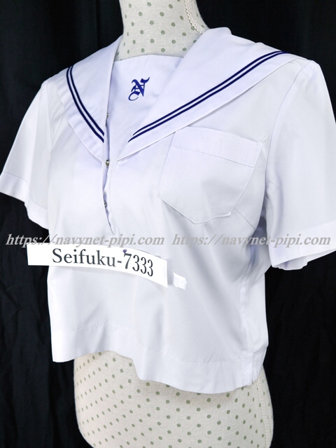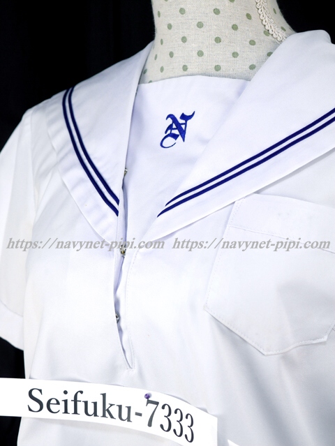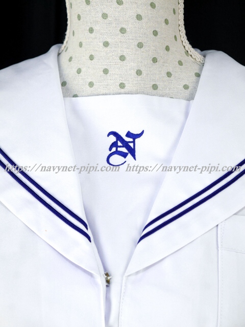 | 詳細/特徴 夏服(上着・半袖) 白の半袖セーラーです♪ セーラー襟に紺色の丸ライン2本☆ 左脇下ファスナー・胸ポケット付き 胸当てに校章刺繍入り♪ |