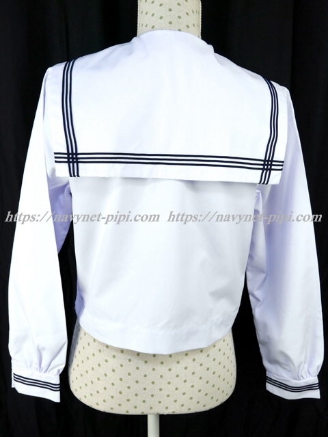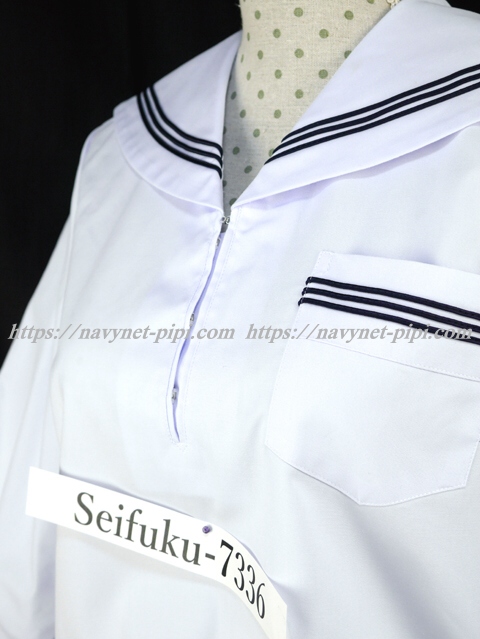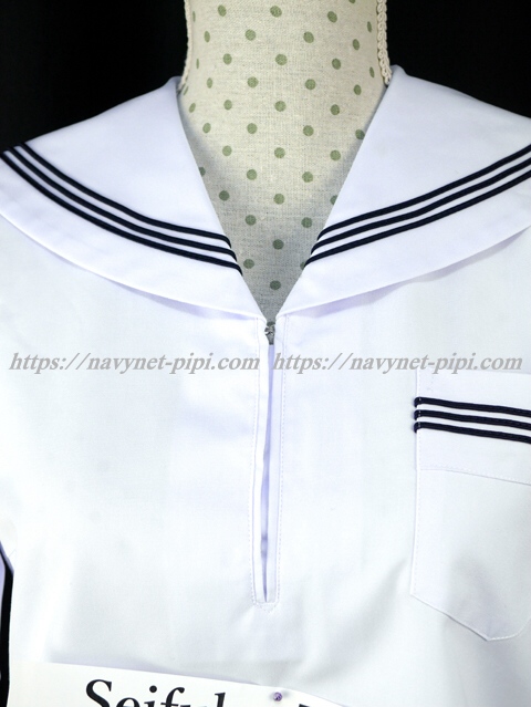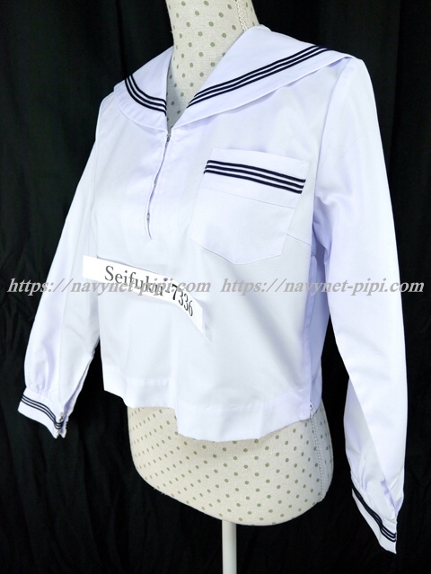 | 詳細/特徴 夏服(上着・合服) 白の長袖セーラーです♪ セーラー襟と胸ポケットと両袖口に紺色の丸ライン3本入り☆ 左脇下ファスナー・胸ポケット付き♪ |