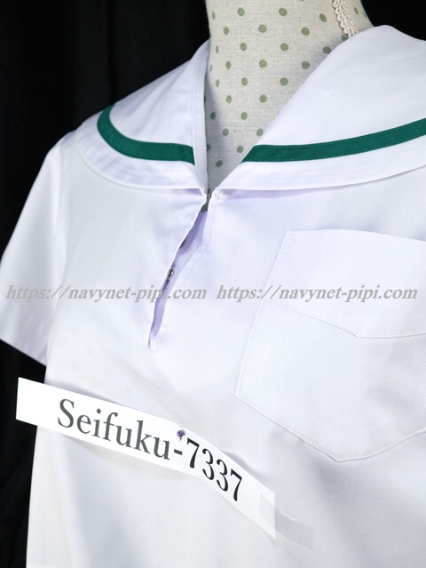 | 詳細/特徴 夏服(上着・半袖) 白の半袖セーラーです♪ セーラー襟にグリーンの1ライン入り☆ 左脇下ファスナー・胸ポケット付き♪ |
