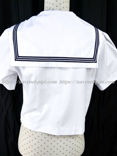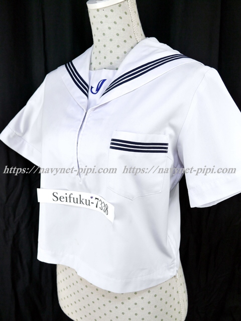 | 詳細/特徴 夏服(上着) 1箇所シミ 白い半袖のセーラー服♪ セーラー襟と胸ホケットに紺線3本入り☆ 人気の胸当てに校章刺繍と3本ライン☆ 左脇下ファスナー☆ |