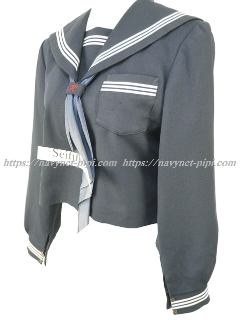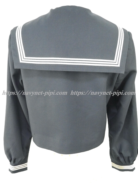 セーラー襟と両袖口と胸ポケットと胸当てに白線3本入り☆