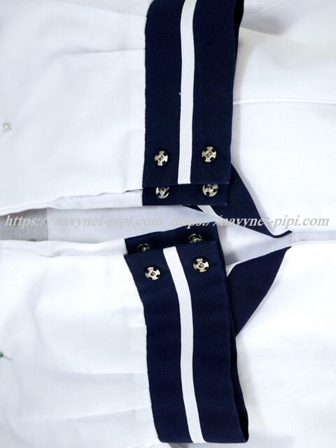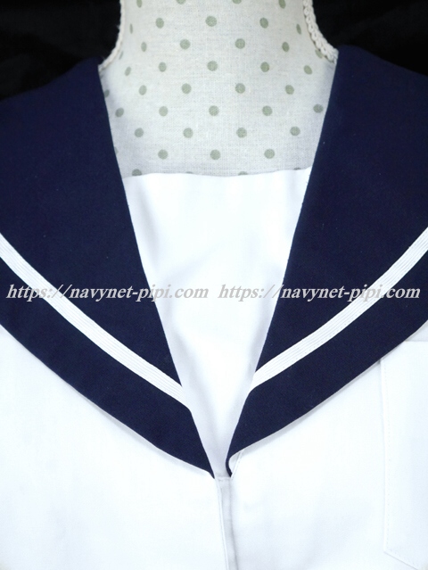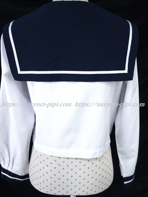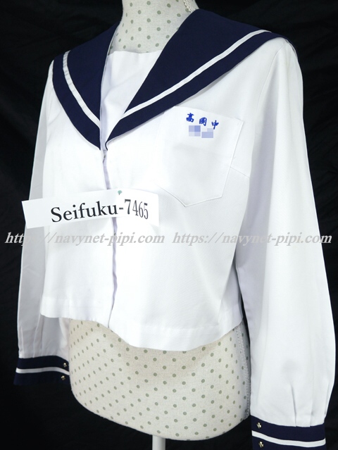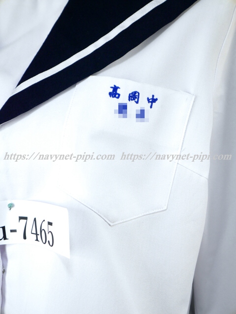 | 詳細/特徴 夏服(上着・合服) 高岡中学校 白の長袖セーラーです♪ セーラー襟と両袖口が紺色で白線1本入り☆ 前開きスナップ・胸当て付き♪ 胸ポケットに校名とネーム刺繍☆ |