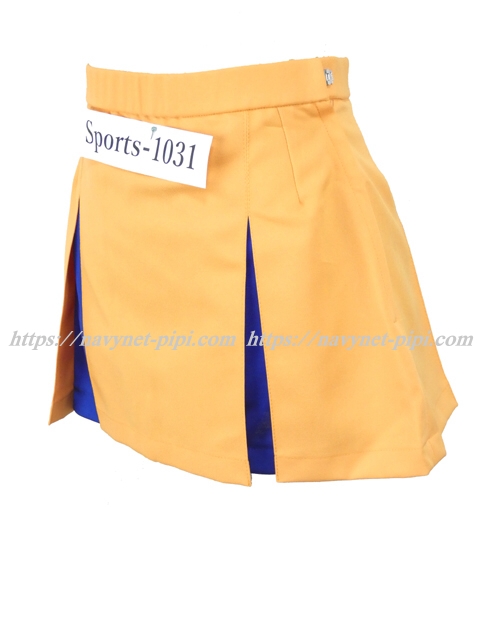 | 詳細/特徴 デザインプリーツ チアー 鮮やかなオレンジ色のスコート♪ 前後4本プリーツ内はブルー生地のアクセント 3段ホック留め・ファスナー☆ |